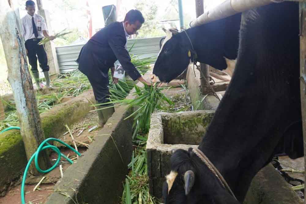 Siswa SMK Lembah Hijau Batang memberi pakan ternak sapi. (Foto : batangkab.go.id)