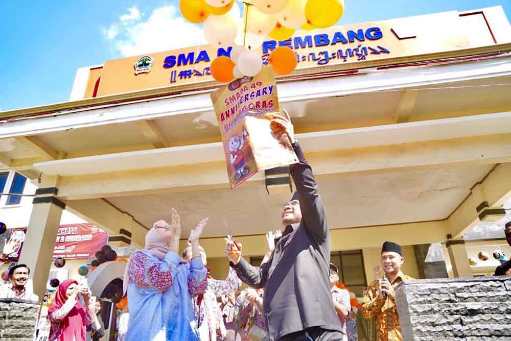 HUT Ke-49 SMA 2 Rembang, ditandai pemotongan tumpeng, dilanjutkan dengan pelepasan balon ke udara oleh Yaqut dan Eny Retno.