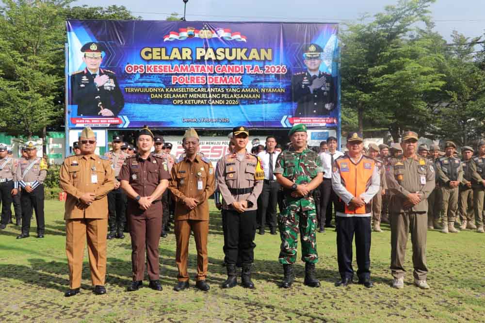 HALO DEMAK – Wakapolres Demak Kompol Hendrie Suryo Liquisasono, memimpin Apel Gelar Pasukan Operasi Keselamatan Candi 2026, di Lapangan Wicaksana Laghawa, Polres Demak, Senin (2/2/2026).