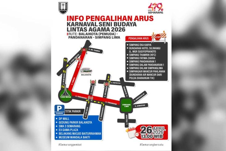 “Kami sediakan kantong parkir resmi di beberapa titik strategis. Untuk area start ada di DP Mall dan Gedung Parkir Balai Kota. Bisa juga menggunakan SMA 3 Semarang dan Museum Mandala Bhakti. Sedangkan untuk titik finish, warga bisa parkir di Ex Gama Plaza atau di belakang Masjid Baiturrahman,” jelasnya.