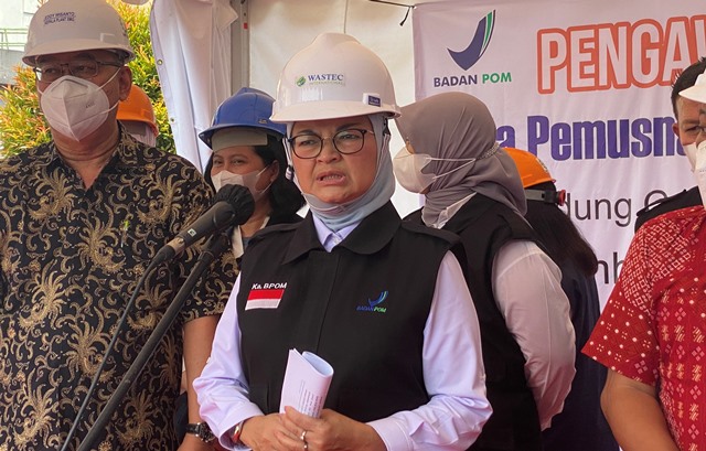Badan Pengawasan Obat dan Makanan (BPOM) Republik Indonesia (RI) juga mengawal pemusnahan ratusan ribu obat jenis sirup yang mengandung Etilen Glikol (EG)/Dietilen Glikol (DEG) di PT Wastec International Semarang Senin (12/12/2022). Pemusnahan itu dilakukan karena obat yang diproduksi oleh PT Ciubros Farma Kota Semarang melebih batas kadar aman.